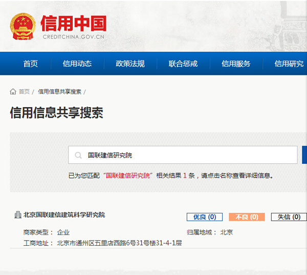 国联建信研究院(中国建设信用平台)信用评级资质 1、北京市工商行政管理局批准成立的集体所有股份制企业; 2、中国人民银行征信中心认定的信用机构(代码:G1011011213970720K); 3、具备多地政府重点工程项目招投标信用评级资格(北京、辽宁、河南、浙江、上海、江苏、安徽、陕西等地); 4、国内首家住房和城乡建设领域信用评价及认证管理机构; 5、中国信用认证服务产业联盟秘书长单位; 6、商务部和国资委信用评价战略合作机构; 7、评级结果得到国务院直属“中国打击侵权假冒工作网”认可; ... 详细>>
